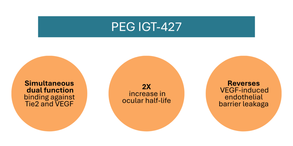 Mosaic and Ingenia generated an improved bispecific pegylated antibody, IGT-427, that has dual function of VEGF inhibition and Tie2 activation. The improved activity of IGT-427 includes direct activation of Tie2 that exceeds Ang2 blockade in vitro, protection against Tie2 downregulation from proteases, and long-lasting half-life in the vitreous. These higher and longer-acting pharmacodynamics, may lead to increased patient response and decreased frequency of administration compared to current standard of care.